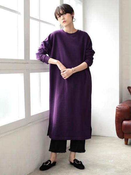 裙裝造型總給人溫和柔美的印象,而褲裝的搭配則表達出了率性風格。利用秋冬感強烈的紫色調配色並以九分直筒寬褲為內搭,便能展現個性感十足的時髦態度,踏上穆勒鞋款還能表現出休閒女子的慵懶氣質。