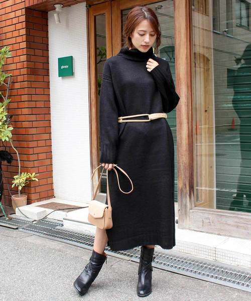 黑色的高領長版上衣,採用厚針織的面料為肌膚提供從頭到腳的完整保暖。以單穿加上高跟靴的穿搭巧思,能使造型流露出優雅氣息,即使色系單一也能創造出聚焦的迷人魅力。