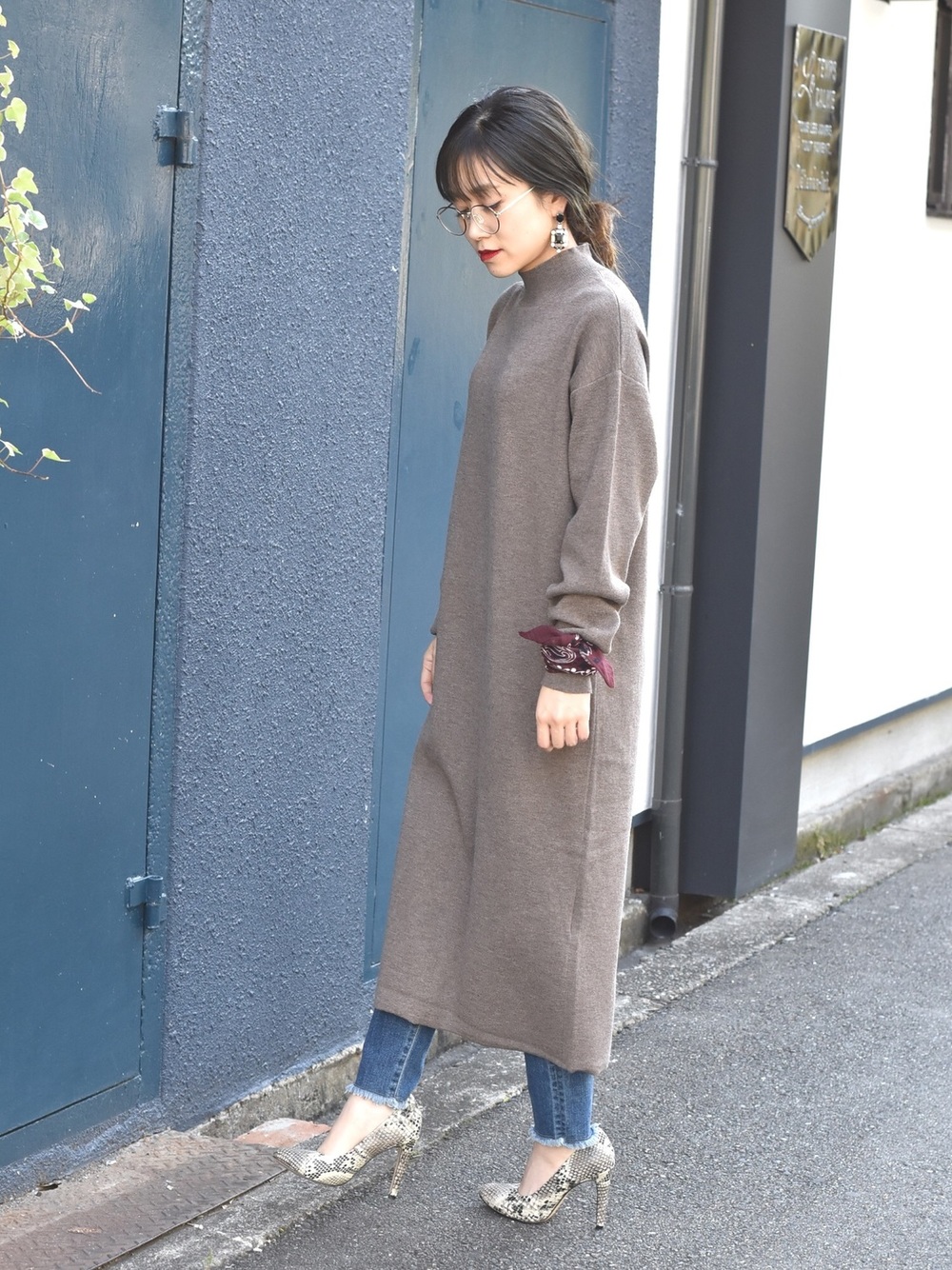 總是能輕鬆搭配出好感度的大地色系是每位女生鍾愛的穿搭色彩,想表達簡約舒適的造型形象時,運用小高領設計的棕色長版針織衫,內搭合身的牛仔褲款便能呈現出與眾不同的深刻品味。若擔心比例不佳的話就利用高跟鞋表現纖細且高挑的修身體態。