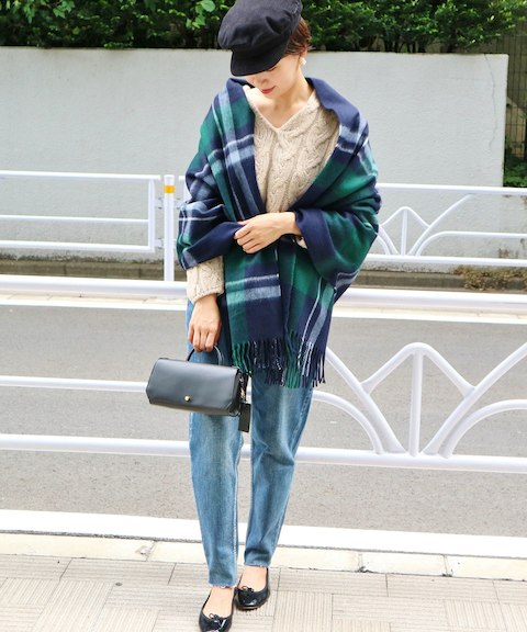 除了穿戴在身上以外,日本女生也時常將格紋圍巾拿在手上做為穿搭的一部分。利用手拿的方式巧妙地增強造型感,不經意的小巧思讓圍巾的佩戴法又增加了一個。