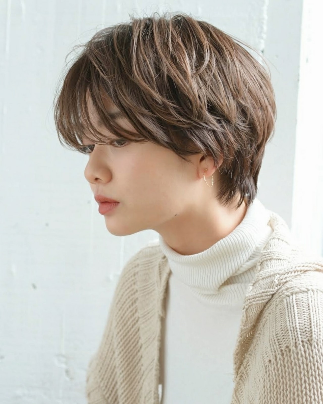 透過低層次的短直髮風格能表達輕熟的大人感印象。利用髮根的輕盈空氣感蓬鬆捲度營造出慵懶的隨興氣息,再加上微卷彎度的瀏海與髮尾,利用輕薄的髮絲感為優雅魅力更加分。
