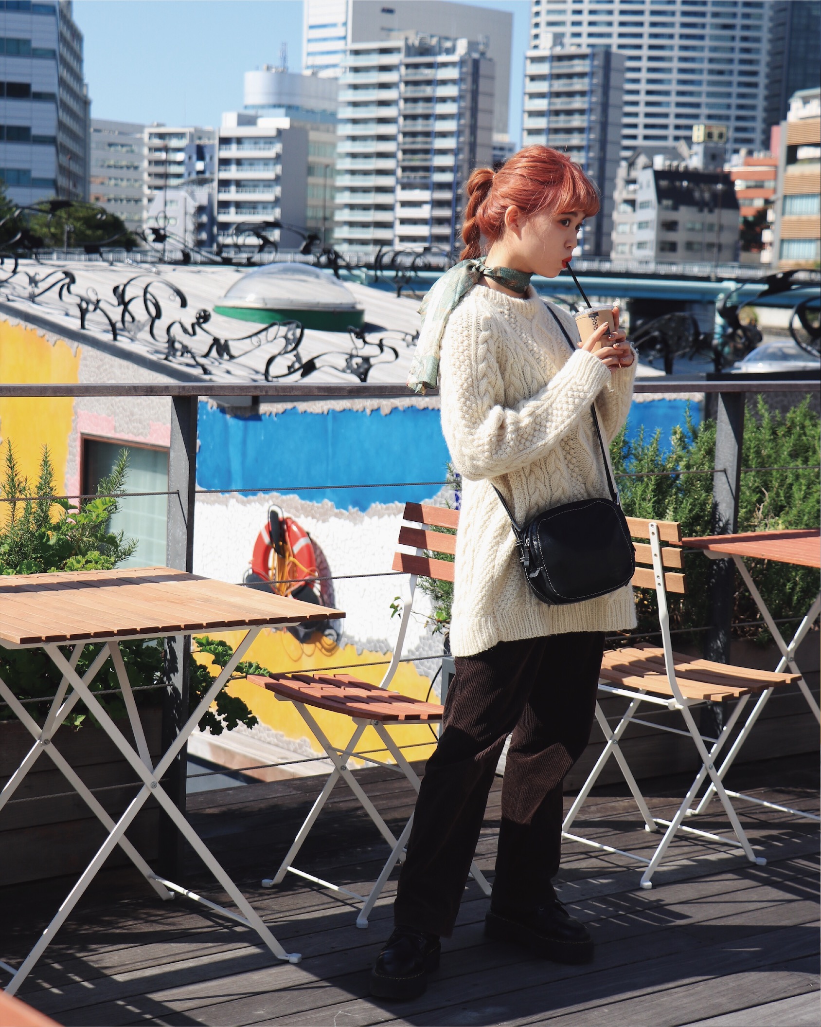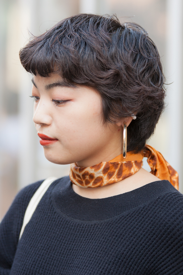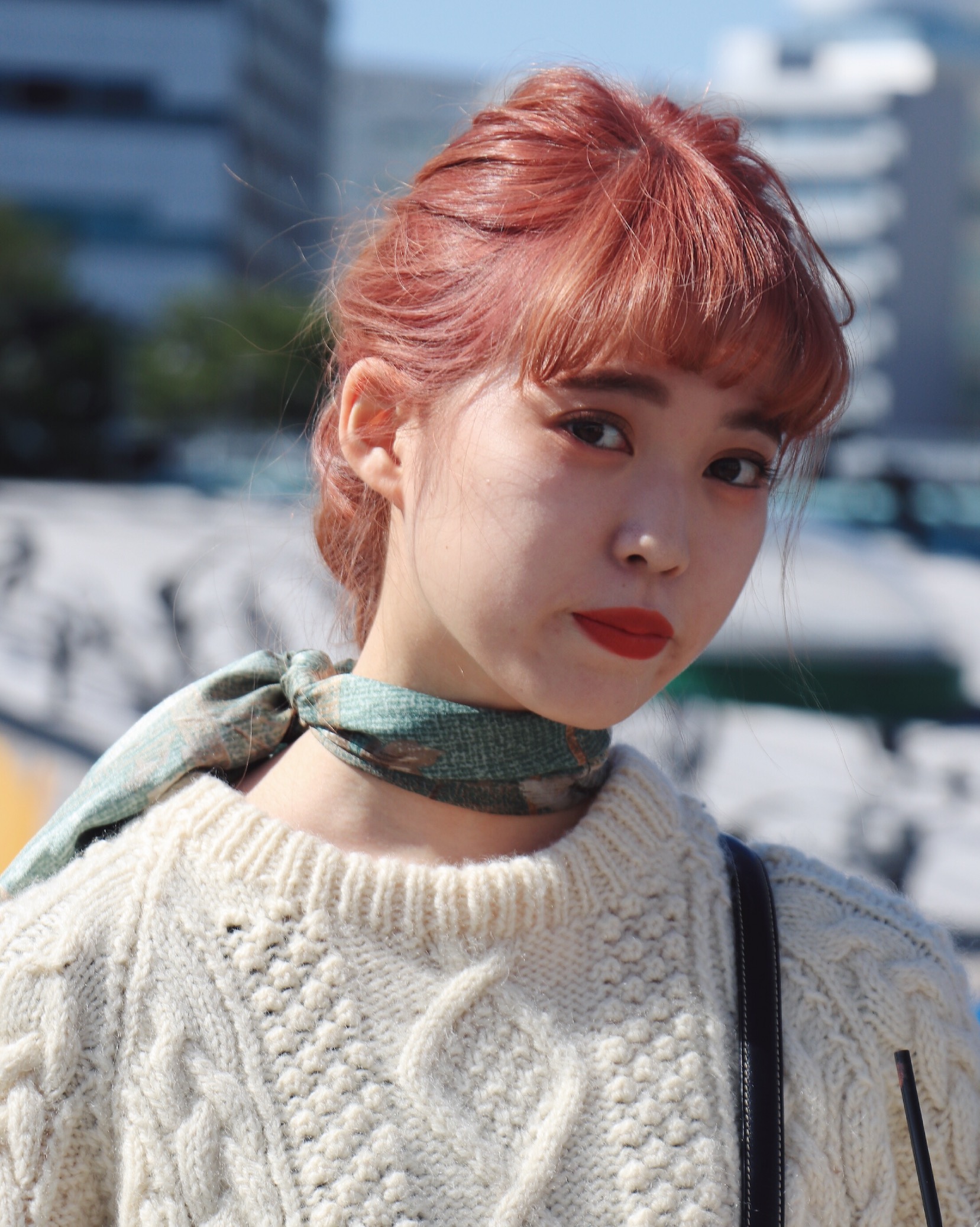 如果上衣是編織毛衣這一類質感紋理較豐富的樣式,可以先將領巾隨興打一個結並讓領巾尾巴放在後方,帶出些許隨性不造作的氣質。正面呈現出類似 Choker 項圈的戴法也展現了一股時髦氣息。