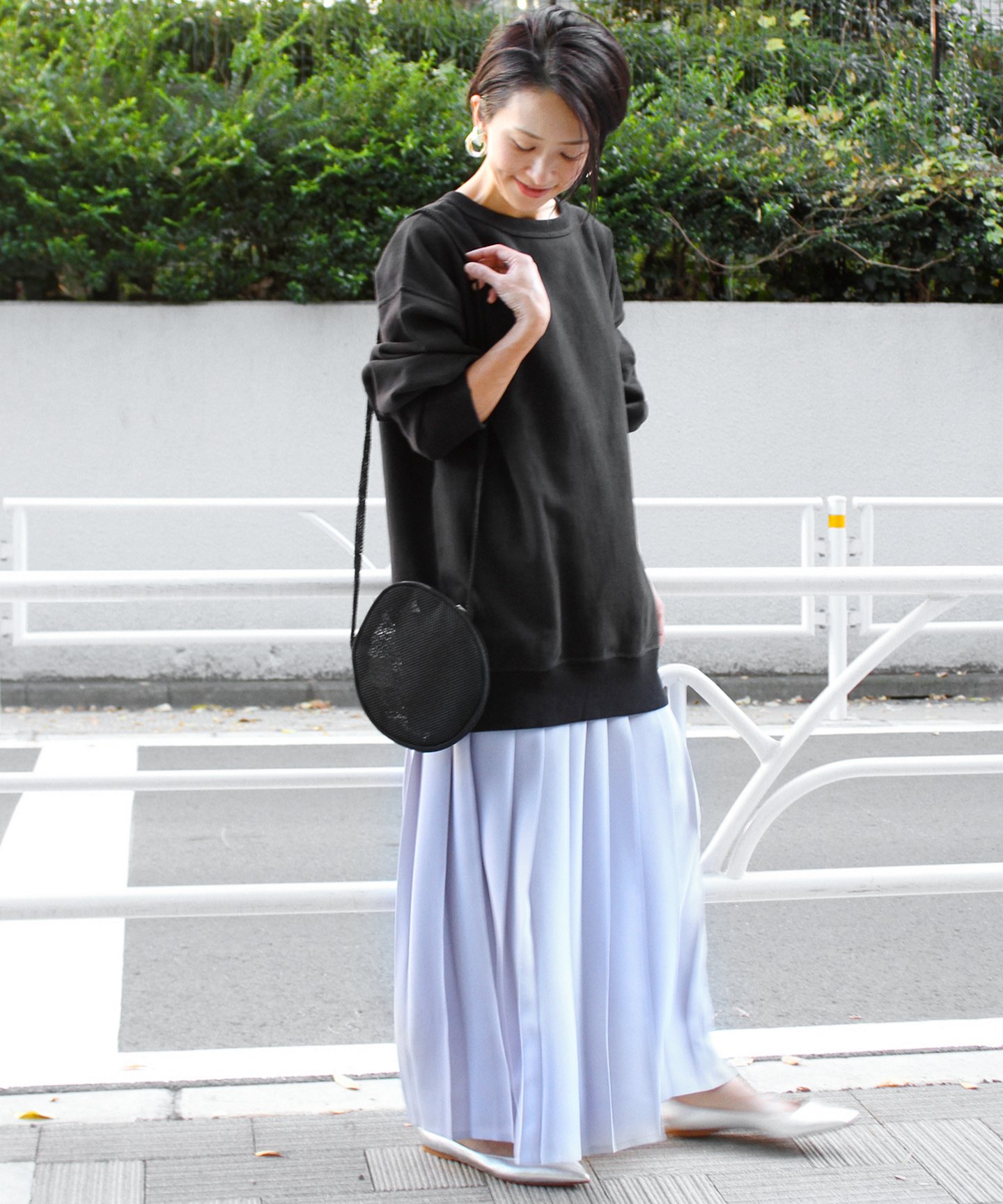 用深色的衛衣搭配上略帶光澤感的淡色百褶裙,黑色上衣可以維持應有的大人氛圍,飄逸的裙裝則為整體營造了適當的女孩感。