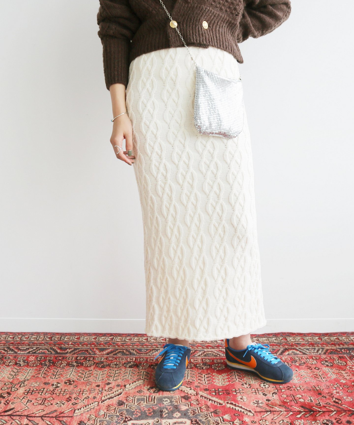 不用花時間思考穿搭,冬天的穿搭利用針織 X 針織的方式就可以迅速完裝。利用寬鬆的針織上衣搭配上窄版的針織長裙,合乎身形的「上微寬、下略窄」比例就能營造出兼具舒適度與好感的日常衣著。