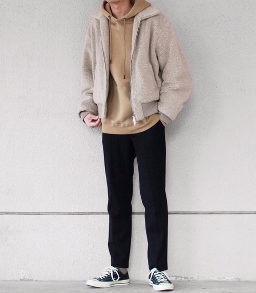 延續前一的同色系穿搭,選擇駝色系帽 TEE 及相近的燕麥色刷毛夾克,展現出不同於以往的好感休閒風格。