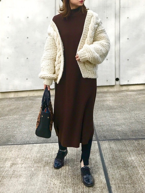 利用針織外套就能讓冬天經常著用的長版洋裝穿搭出不同於他人的衣著氛圍。外短內長的層次感使基礎色彩不再低調,對比的明暗配色讓簡單穿搭也能相當有記憶度。