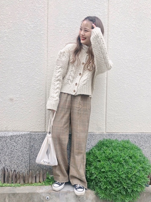 利用同色調的高領上衣做出針織開襟外套的層次感,搭配上冬季定番的格紋寬褲,柔美的奶茶色調呈現出溫柔可人的氣質氛圍。