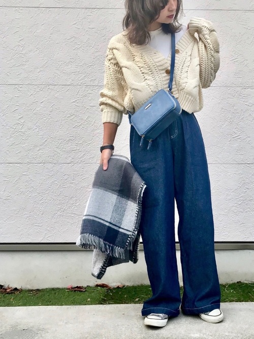 針織衫與丹寧褲是兩個相當基本的衣著單品,但兩者相互搭配之下便能展現相當亮眼的休閒時髦感。透過開襟的設計表現出柔和的肩膀線條讓造型的好感度大大提升。
