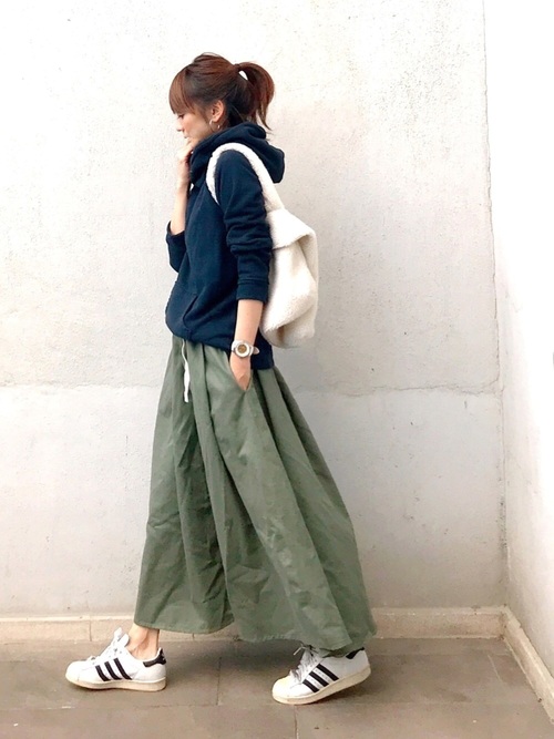 想穿著輕鬆卻擔心會過有邋遢感時,就挑選有 Logo 字樣的帽 Tee 混搭裙裝著用吧。利用運動鞋展現頭尾的一致性,剛剛好的休閒印象讓人想每天都這樣穿搭。