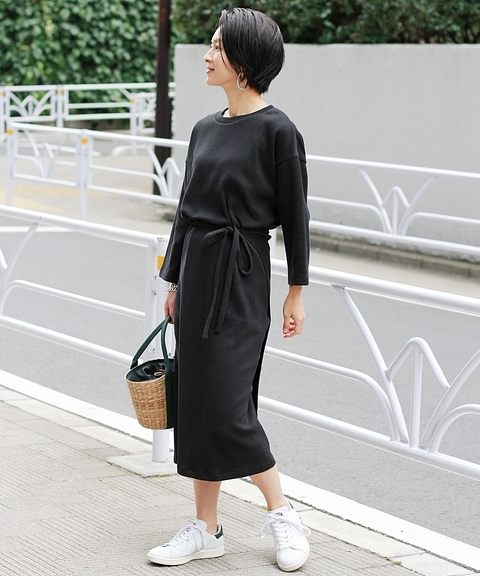 基礎色的連身洋裝雖然可以詮釋出俐落性格,但有些平庸的造型感不小心就會顯得老態。此時不妨以對比色調的運動鞋來為穿搭注入些許青春活力。