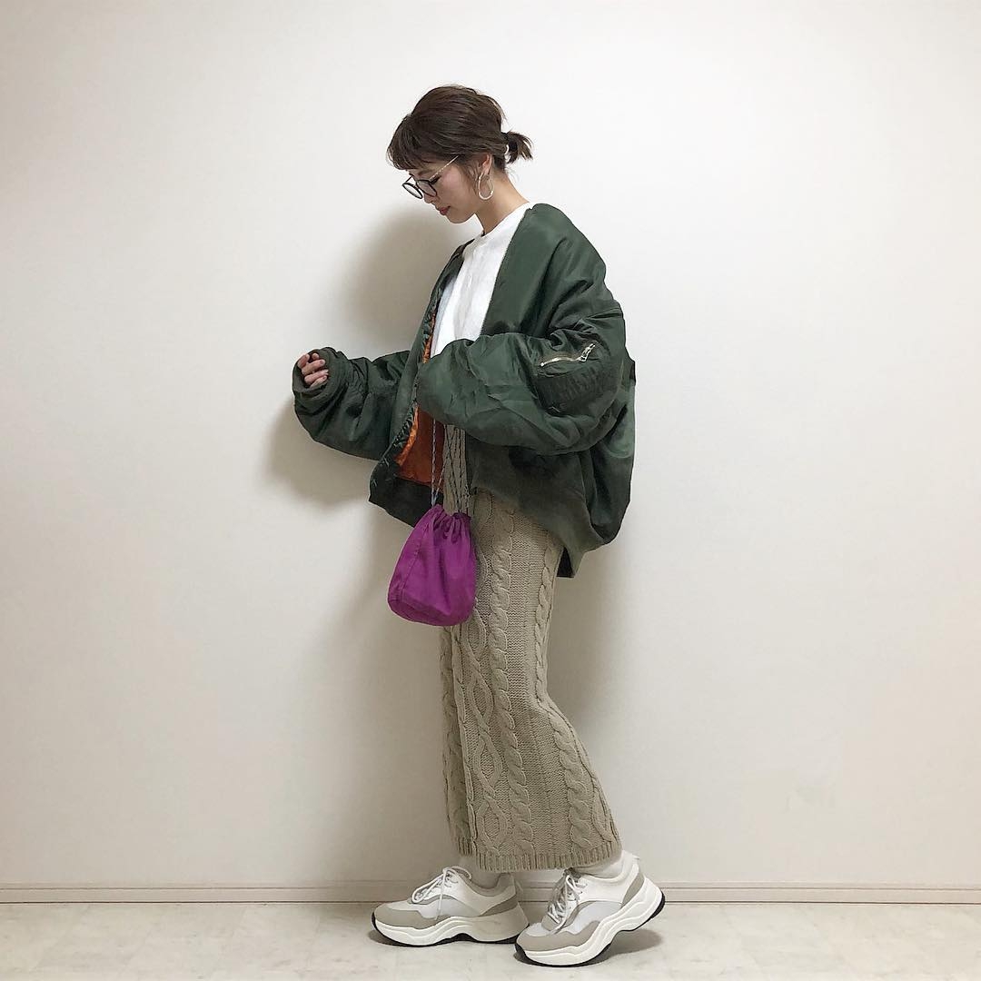 以經典軍綠色的 MA-1 飛行外套,結合內外撞色的設計,使小細節也能同時擁有格外搶眼的注目度。選擇 T-shirt 與針織寬褲的搭配意外地為整體提升了好感滿分的女孩印象,簡單踏上復古球鞋即能展現舒適自然的衣著風格。