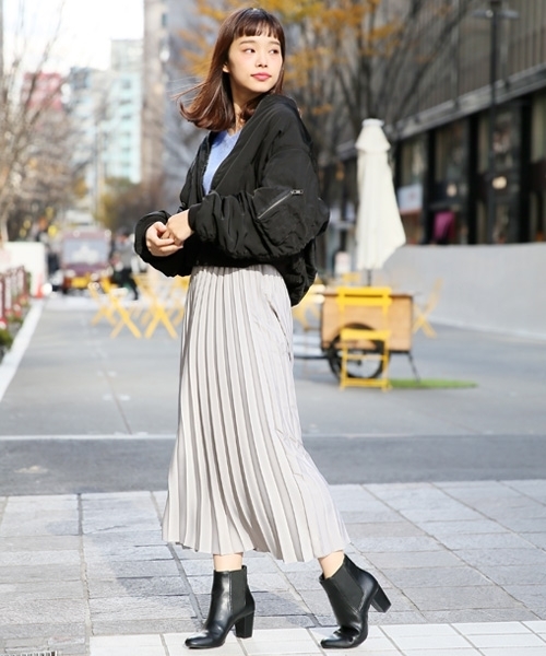 男孩風格濃厚的飛行外套結合了杏色的配色,使單品散發出一股甜辛的俏皮氛圍。選搭同屬大地色彩的上衣與長裙,利用深淺漸層增加視覺的豐富層次,混搭和上身衣著呼應的磚紅色高跟靴,立即展演出別有品味的穿搭表現。
