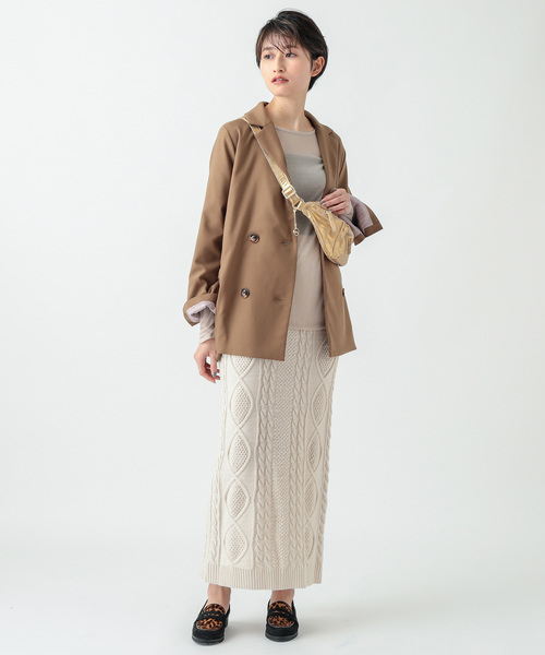 麻花造型的針織裙乍看之下不利修身,但透過直筒剪裁加上側邊開岔設計就能使腿部擁有顯瘦的修飾度。選擇素色上衣外搭西裝外套,出充滿春季意象的服飾風格為整體增添迷人的質感品味。