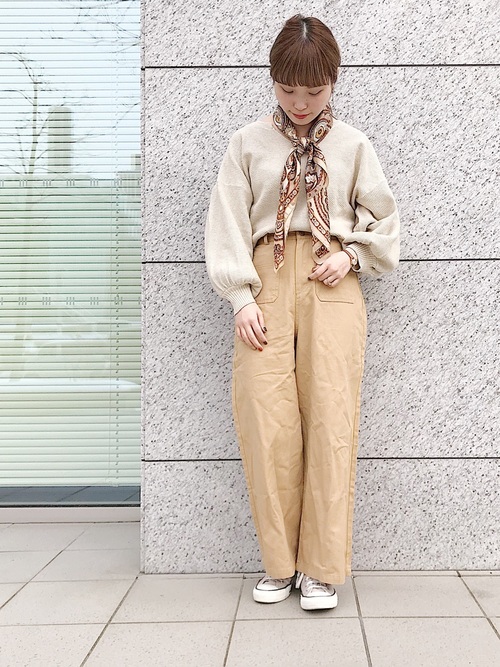 帶點灰色調的淺駝色單品為整體造型增添了冷淡而迷人的女子氛圍,而針織材質的選用則是能不失春日該有的溫柔印象。杏色帆布鞋的休閒感則為衣著注入了輕鬆氣息。