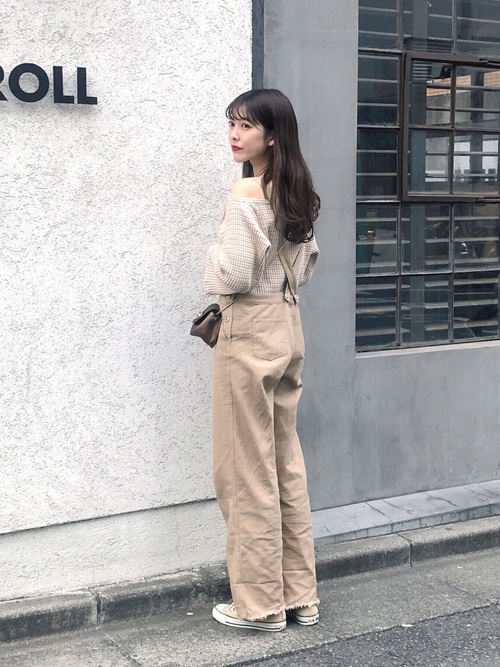 小露香肩營造出春日的女人味,選用與膚色相近的奶茶色系服裝打造不落俗套的小小性感氛圍。避免露肩衣著的成熟感,以吊帶寬褲及杏色帆布鞋相搭都是可以表現年輕感的方式。