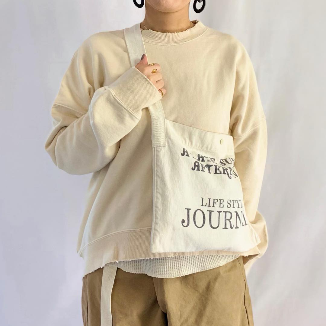 以米色的帽 Tee 及薄針織長裙的搭配詮釋出一股溫暖好感的春日印象。上下身同樣以不同風格單品所組成,鞋履部分就選擇杏色帆布鞋來完成日系感的混搭造型。
