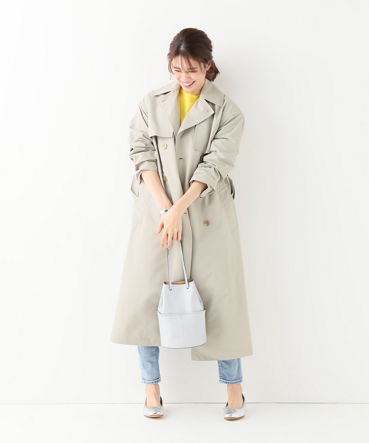平常就經常以牛仔褲穿搭,想要能立即讓造型有不一樣的感覺時就嘗試一下外搭上一件卡其色的風衣外套吧!不僅有效將身形拉長,隨動作飄逸的衣襬還賦予了整體氣勢感的女子印象。