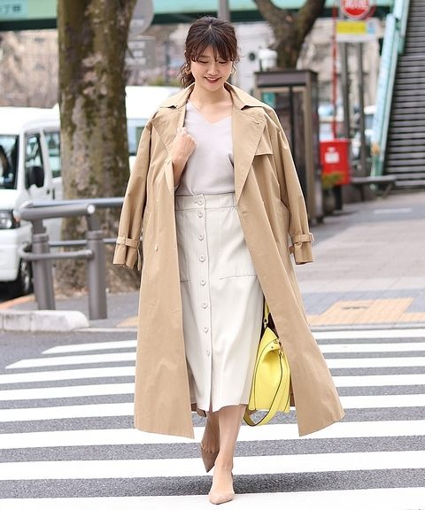 比起青春感的洋裝,想加乘長版風衣的女人味就以長裙完成穿搭吧。選擇窄版長裙能讓衣著氣質表現出都會女子的幹練印象,而飄逸感的百褶裙裝則讓整體散發一股洗鍊的優雅氣息。