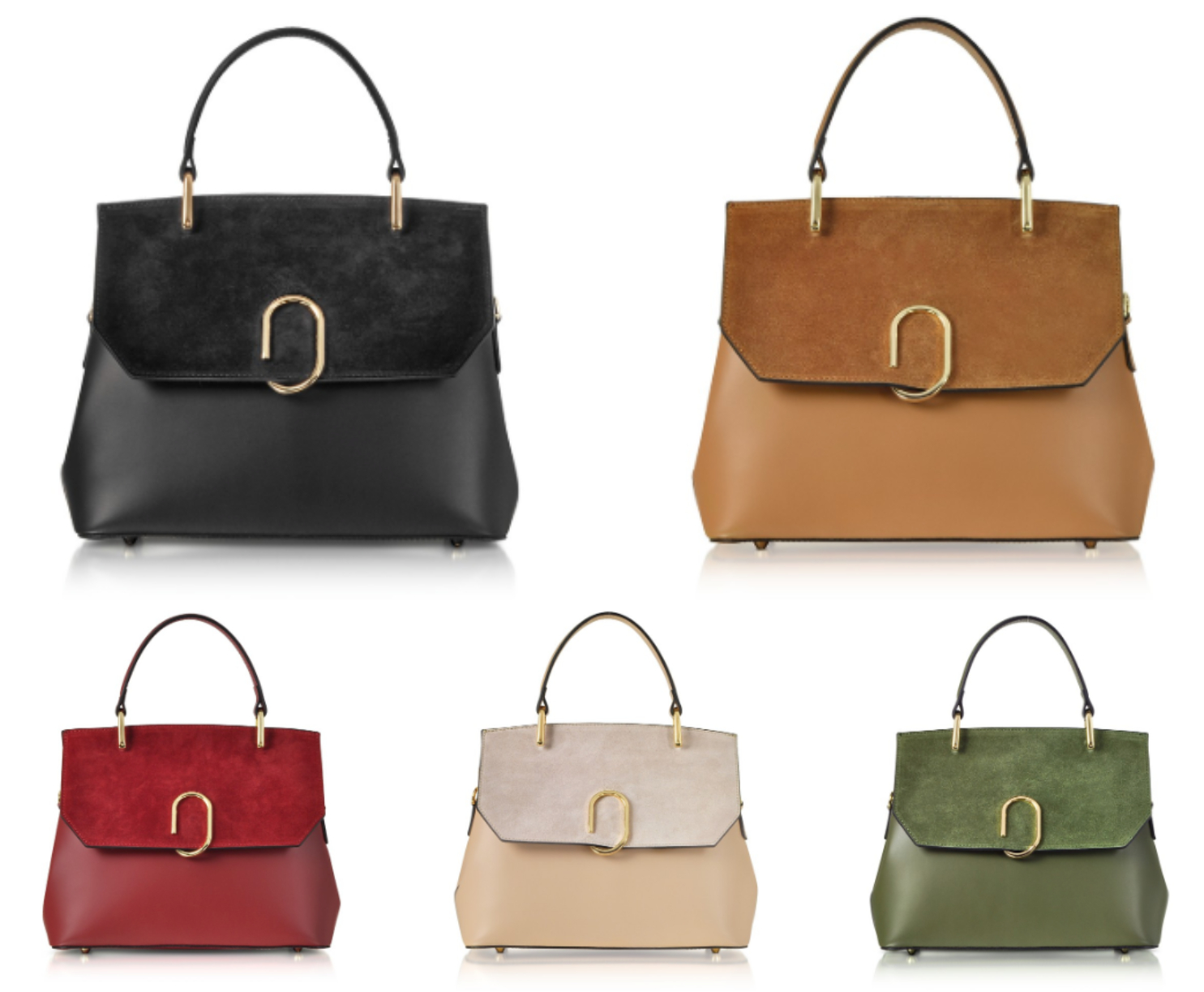 首先要推的這款屬於麂皮與皮革的拼接款,搭配金屬扣環元素讓整個包款的質感亮了起來,其中麂皮的處理相當細緻,小編個人覺得綠色款、裸色款、紅色款都非常亮眼,美到讓人選擇障礙!