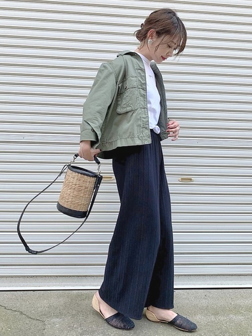 不常穿著軍綠色單品的話,選擇基本色的黑色一同搭配就一定不會失誤。將性格感的軍風夾克搭配上優雅的百摺褲裝,有點衝突卻意外協調的美感相當有印象感。