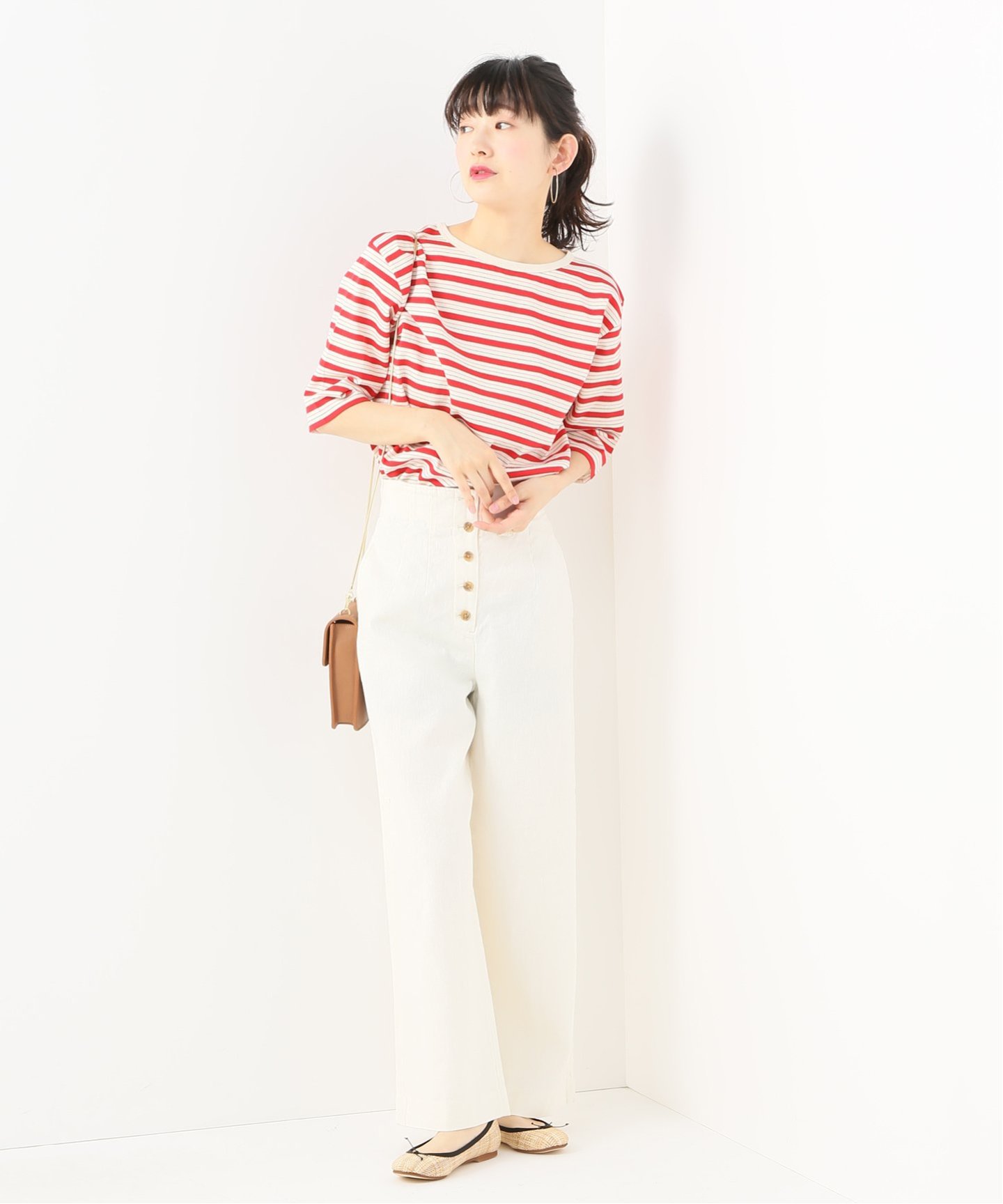 想要傳達清爽的造型印象卻又不習慣穿著全白的褲款時,就避免選擇全素面的款式吧。利用線條來為以白色為底色的長褲呈現洗鍊感,順著腿部線條的直條紋還可以達到修飾腿型的效果。