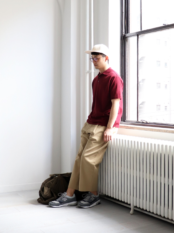 服裝品牌 mature 其實是來自另一日本品牌 maillot 的高端支線,利用更高質感素材與縫紉技術呈現 maillot 對於服裝堅持的完整面貌。版型介於寬闊與合身間,無論紳士感或休閒風格都能完美詮釋。而將酒紅上身搭配卡其寬褲及寬沿棒球帽,更是略帶成熟的完美休閒穿搭。