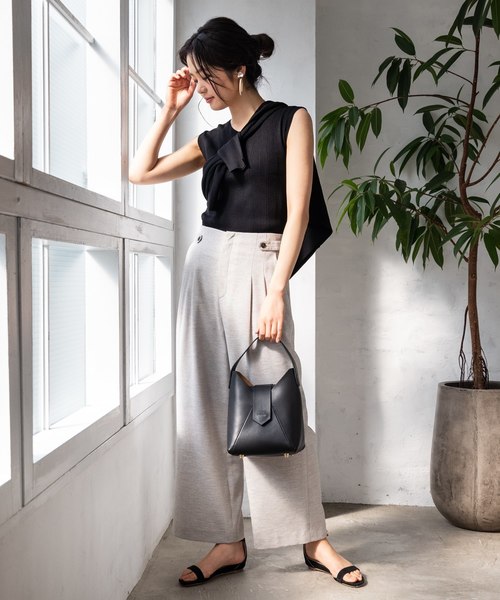 除了基本款的針織背心之外,本季日本女生也相當流行斜肩的背心款。不規則的斜面剪裁使衣著流露出神秘的小性感,再搭配寬鬆俐落的落地長褲即可打造出修長身型,營造大人感的女性魅力。