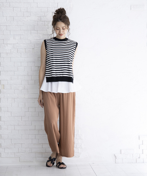 飄逸感的夏日單品組合而成的穿搭中,若覺得少了些重點的話不妨就添加上一件薄針織背心吧。在室外時也許會感到些許悶熱,但簡單的層次穿搭於冷氣房的室內卻相當剛好。