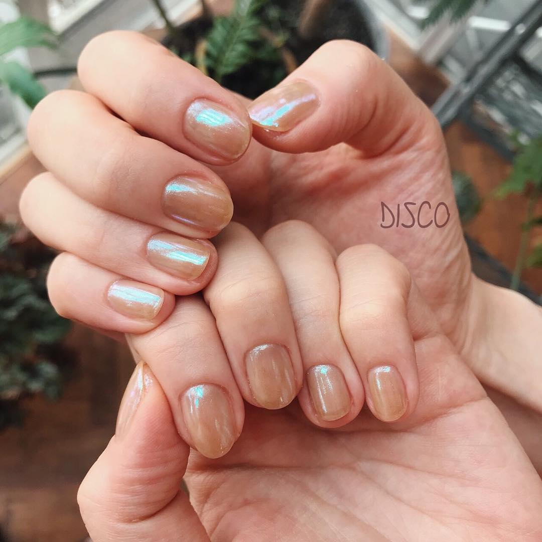若不習慣或工作不允許太過華麗的指彩,可以考慮透著貝母偏光的單色光澤款式。由 DISCO 美甲師調製出的底色就已充滿時髦氛圍,再刷上上層光澤,讓指甲仿若寶石,詮釋出低調華麗風格。