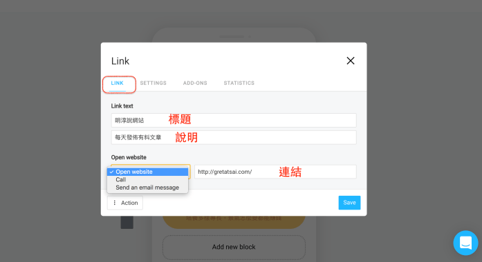 接著填入標題、說明,下方選擇Open Website填入你的網站連結。