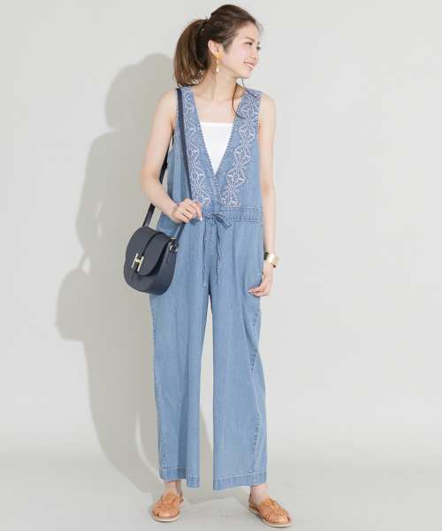 結合民族風元素的吊帶牛仔褲,在腰間透過鬆緊帶造型不僅能使身形顯高顯瘦之外,選搭平口上衣打造率性輕鬆的意象,簡單搭配平底拖鞋或涼鞋就很好看。