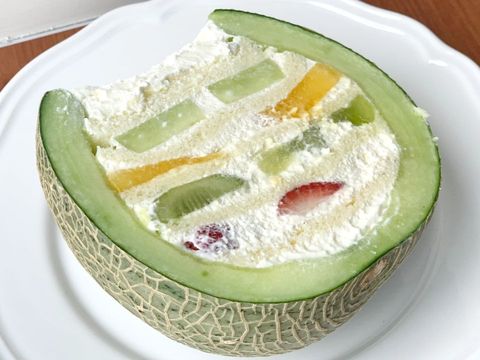 店內哈密瓜使用的是台灣在地的台南鹽水哈密瓜,果肉扎實、香氣濃郁!在挖掉哈密瓜果肉後填入的一層層內餡,包括一整顆的草莓、奇異果和台灣芒果,每日新鮮現做,大約是6吋蛋糕左右的大小!