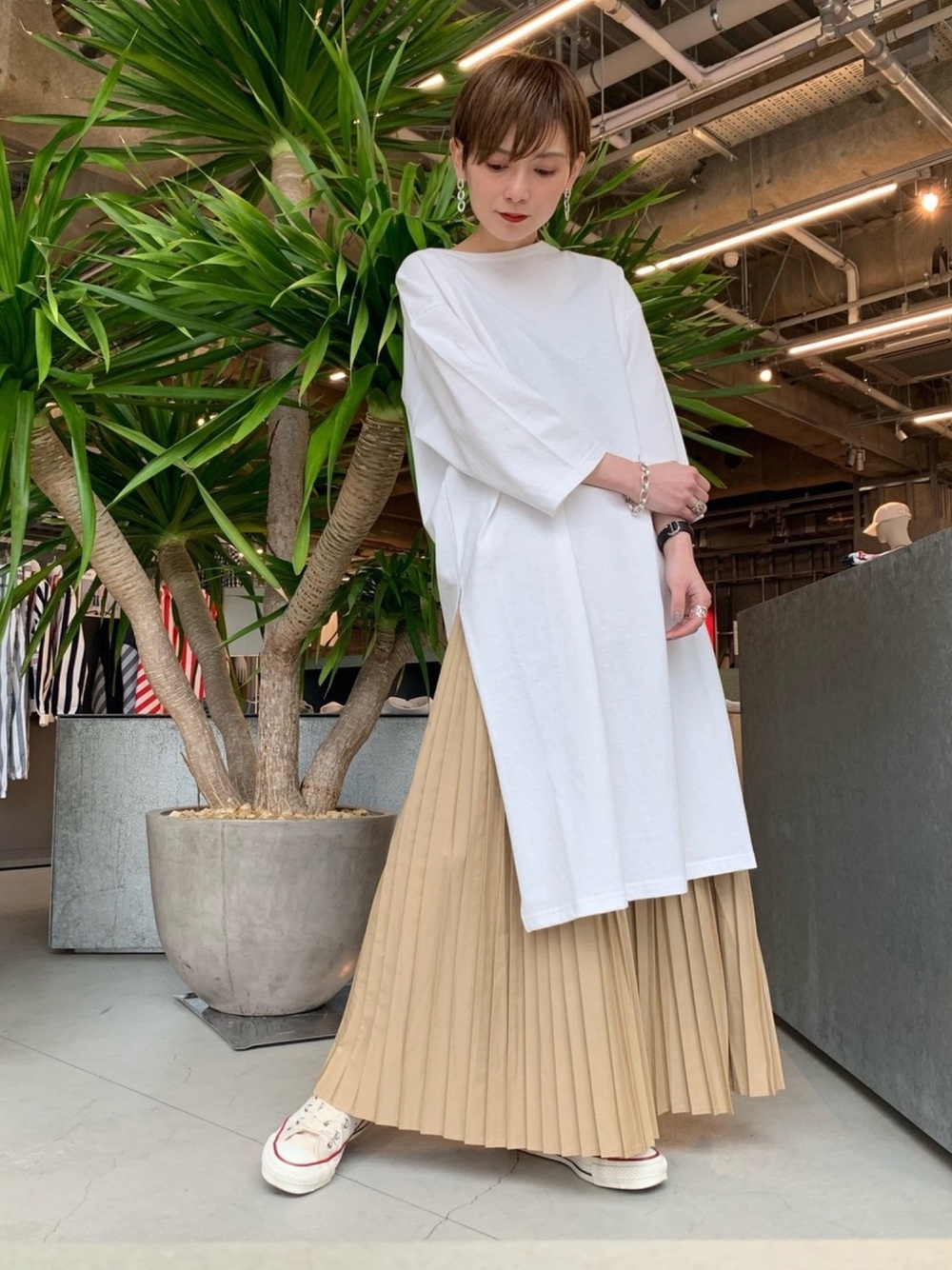 基本款的白色長版 Tee 加上側邊開衩,不僅能提升特色重點還能同時讓穿搭更具豐富度。內搭杏色百褶裙不經意露出裙襬弧度,使整體賦予立體感十足的穿搭印象。