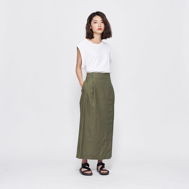 窄版的裙裝乍看之下會讓身形原形畢露,但這一件已一片裙的剪裁所打造的長裙利用側邊鈕扣讓正面有著不對襯的效果,另外又多了兩側的打褶設計,巧妙地利用非平面的設計修飾出筆直長腿,同時又給人簡約時髦的印象。