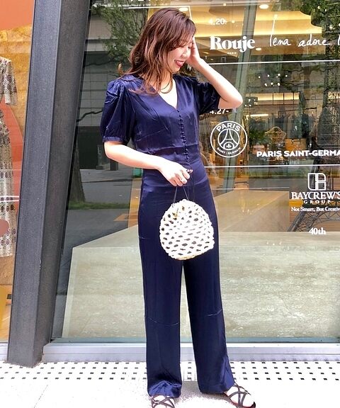 時髦的緞面質料連身褲流露出濃濃的時尚感,再選擇編織材質的包包以及涼鞋呼應夏日季節感,給人些許風格衝突的搭配印象更能讓人過目難忘。