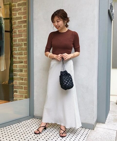 以合身上衣搭配飄逸感的裙裝讓好氣質難以隱藏,若想為這樣的造型增添些許休閒感,利用編織包款一同搭配就沒問題了。