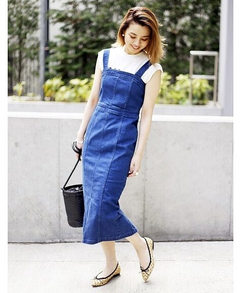 總給人休閒街頭印象的丹寧單品,以裙裝呈現時反而讓女人味更有好感度。若想讓服裝更有拉近距離的效果時,搭配上輕鬆感滿分的編織包會是不錯的選擇。