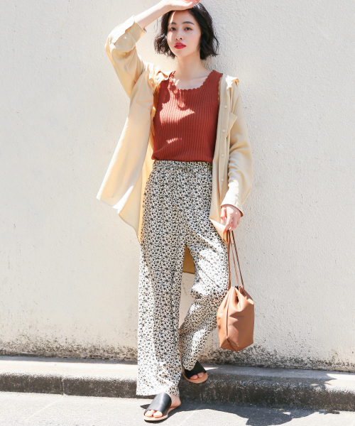 小碎花讓褲裝在慵懶中又能不失可愛感,寬鬆的版型讓長褲在夏日也能展現出怡然自得的服裝感。以背心搭配 oversize 的襯衫作為小碎花長褲的上衣就能充分讓整體更顯輕鬆自在。