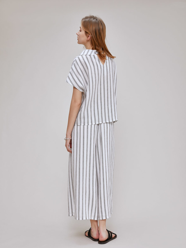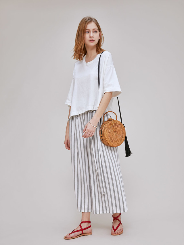 透氣涼感的麻料是夏日寬褲中經常出現的材質選用,不需太高磅數的設計也能展演出俐落的褲子線條。不論是實際的穿著體驗還是透過視覺,都能輕易地感受到屬於棉麻的輕盈與親膚,再搭配上直線條的花色設計,完整的夏日氣息便呼之欲出。