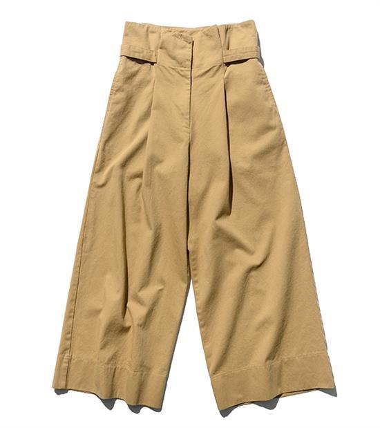 純棉的面料經常以奇諾褲的款式呈現,略帶挺度的棉料材質可以讓身形擁有俐落美型之餘也能給人舒適度極佳的感受。打摺的設計由褲頭處延伸隻大腿褲管,不僅修飾了腹部線條,腿型也能一併有著筆直的長腿線條感。
