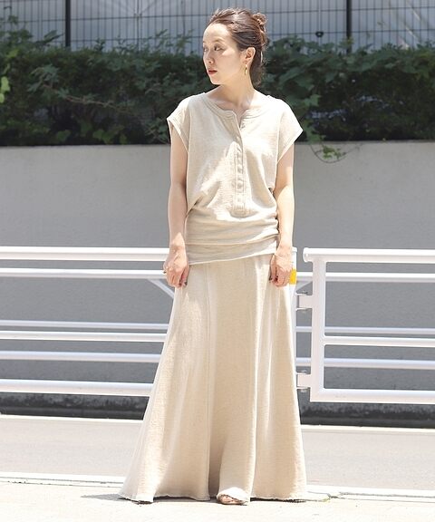 份量感與空氣感兼具的長裙是夏日想穿搭出質感印象的單品選擇,奶茶色讓及踝的款式維持了俏麗氣息,選搭休閒風格的 Logo Tee 就可以完成輕鬆又具十足時髦架式的造型。