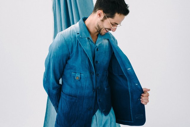 融合歐式工裝與英式獵裝設計,選用高磅數雙層紗製做,布面富凹凸紋理,柔軟透氣。經天然藍染製程,以後染處理的方式染出色階分明的層次,散發優雅氣息。