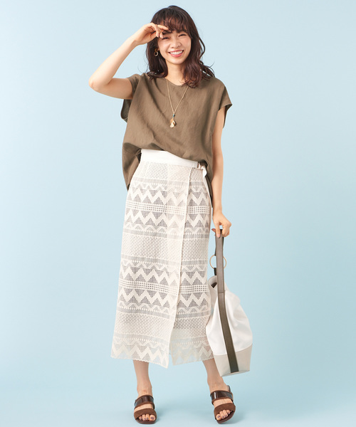 百搭實穿的基本款卡其色包裹長裙,即使不擅長搭配也能靠它輕鬆打造理想風格。例如以平領條紋上衣 + Wrap Skirt 的穿搭方式,再加上藤編帽與拖鞋,就能詮釋出日系休閒感的淑女造型。