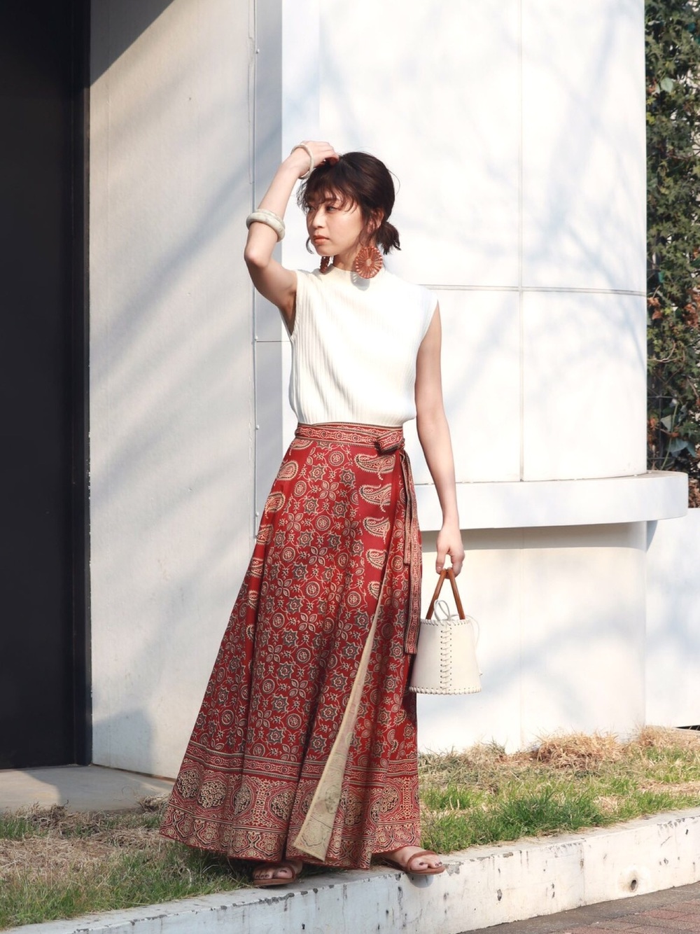 有著變形蟲印花的民族風 Wrap Skirt,輕鬆一件就能為衣著演繹出層次豐富的夏日表情。混搭背心可以傳達簡單品味的清爽氣息,另外融入大耳環讓細節更是充滿注目焦點。