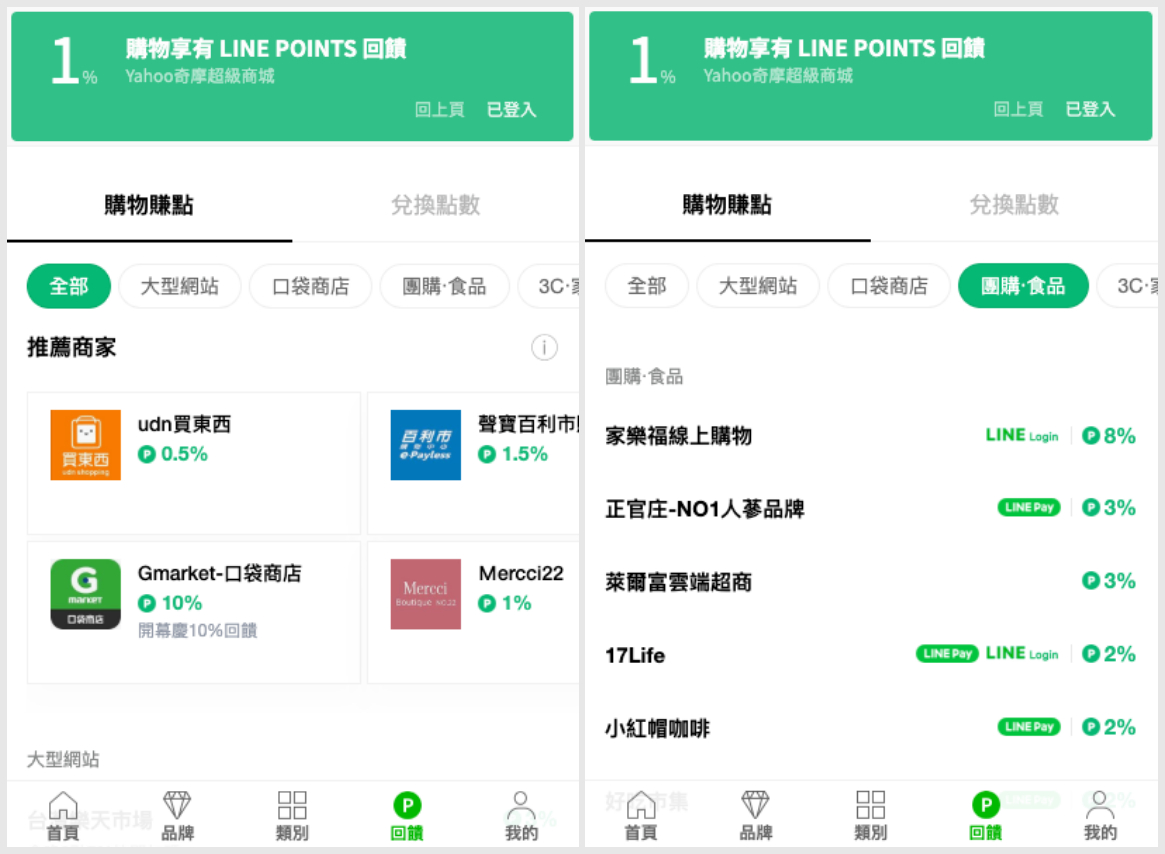 這時只要需要點擊一下右上角的通知,就能自動登入LINE購物囉,只要右上角購物袋圖示轉為綠色實心,就代表已成功登入,這時下單通通能夠賺回饋!