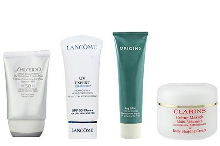▲(左起)SHISEIDO 新艷陽‧夏都會防曬乳 SPF50 UVA(PA++++)、LANCÔME 隔離乳 SPF50 UVA(PA++++)、ORIGINS 品木宣言 漫步在雲端足部護理、克蘭詩 美體緊實霜。