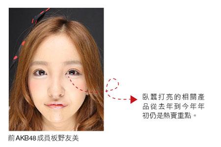 PLAZA TOKYO公關MOMOKO表示,去年流行的「臥蠶妝」是許多女性顧客追隨的化妝重點,也是許多女星在妝容上的小技巧,像是日星前AKB48成員板野友美的妝容就是最佳的臥蠶妝代表。也因此打亮臥蠶的相關彩妝品只要一推出,幾乎銷售一空,在台灣不論是學生族群、OL...都是主要顧客。