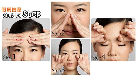 雙手握拳以食指關節於上眼皮滑動,舒緩緊繃眼周肌膚。