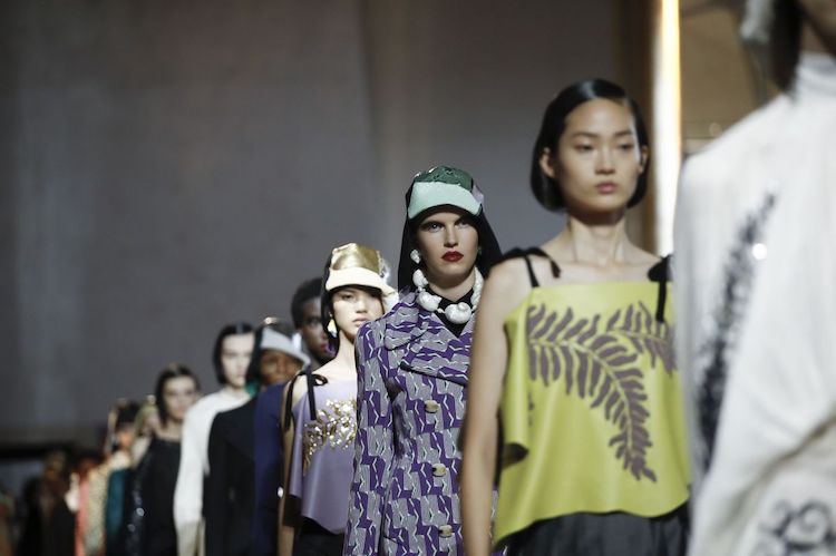 這場秀上除了用質樸的材質演繹極簡風格成話題外,帽飾也是這次的亮點!除了在服裝上用了破碎不收邊的皮革,這次 Prada 推出多款宛如半品般的漁夫帽,前後不規則的帽沿設計,加上不同皮質壓紋的運用,自然直接不造作的設計都呈現了Miuccia Prada 這次秀上的三大重點純真、直率及本能