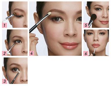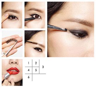 眼妝:由於主要重點在眼線和唇部,因此眼影部分省略也無彷。若希望眼睛看起來更加有神,可沾取少量的打亮產品,輕輕的拍在上眼皮即可。為了加強眼線的吸睛度,眼尾部分可稍微往上勾。臥蠶部分避免上眼影則是另一個要注意的重點。